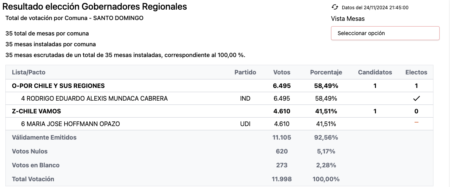 4.353 mesas instaladas por región4.353 mesas escrutadas de un total de 4.353 mesas instaladas, correspondiente al 100,00 %.