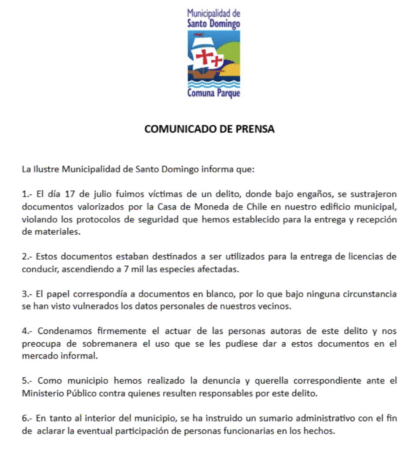 La Ilustre Municipalidad de Santo Domingo emitió una declaración pública respecto al hecho ocurrido el pasado 17 de julio, donde se sustrajeron documentos oficiales desde el edificio consistorial. A continuación, compartimos el comunicado completo