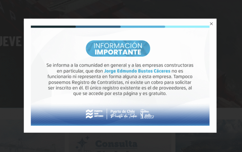 El Puerto de San Antonio emitió un comunicado oficial a través de su sitio web institucional, informando a la comunidad y especialmente a empresas constructoras, que don Jorge Edmundo Bustos Cáceres no es funcionario ni representa en forma alguna a la empresa.