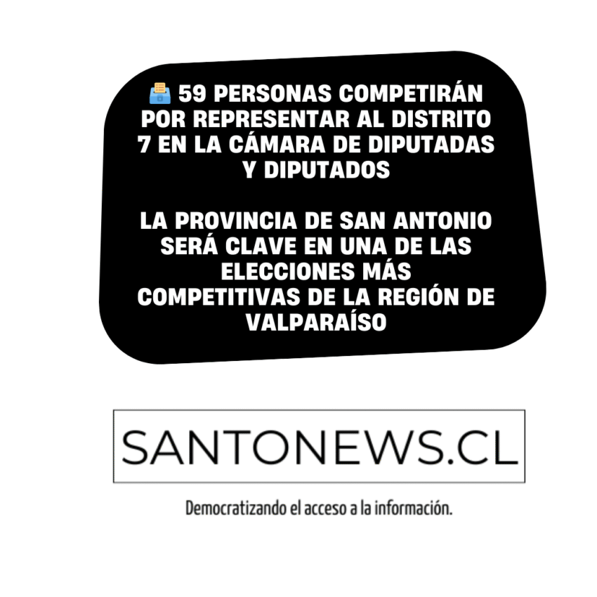 Ya está disponible el listado oficial de candidaturas al Congreso para las elecciones de octubre de 2025. En total, 59 personas postulan para representar al Distrito 7, que incluye a las comunas de San Antonio, Santo Domingo, Cartagena, El Quisco, El Tabo y Algarrobo, además de otras como Valparaíso, Viña del Mar, Casablanca y Rapa Nui.