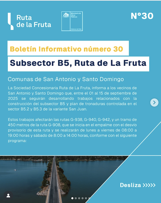 La Sociedad Concesionaria Ruta de La Fruta informó que entre el 1 y el 15 de septiembre de 2025 se mantendrán las obras correspondientes al Subsector B5 del proyecto Ruta de la Fruta, que conecta las comunas de San Antonio y Santo Domingo.