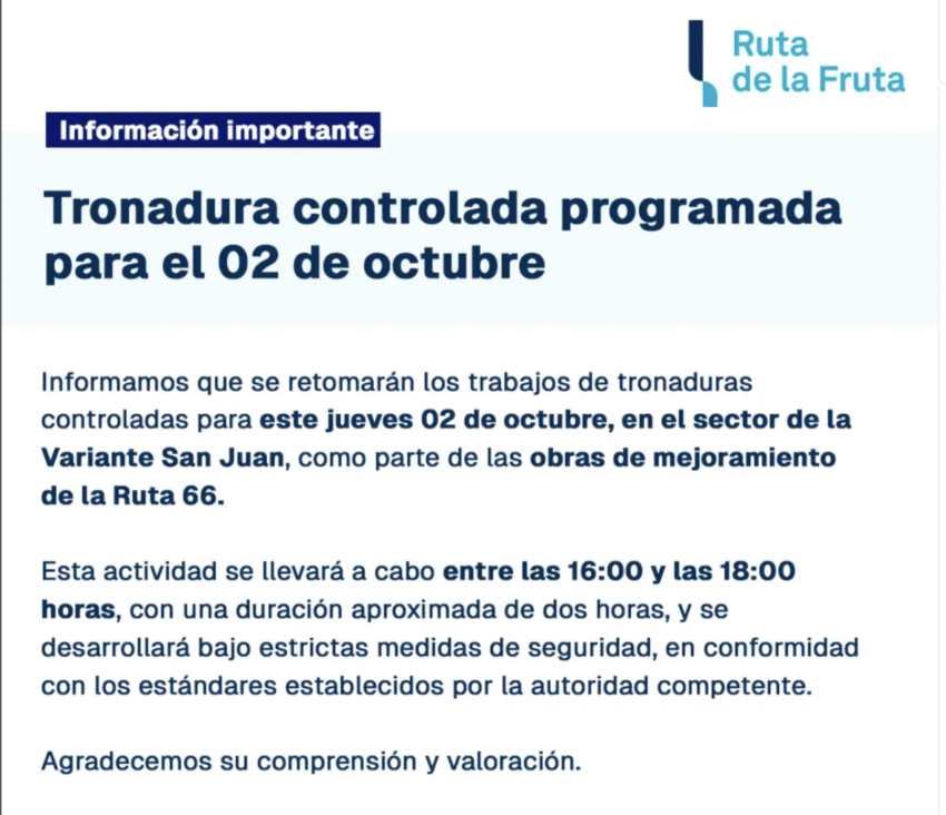 “Esta tronadura es parte de un plan mayor de mejoramiento vial que busca optimizar la conectividad en la zona. Agradecemos a la comunidad su comprensión y colaboración”, indicaron desde el proyecto Ruta de la Fruta.