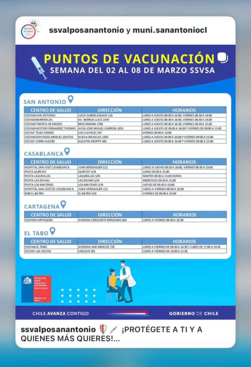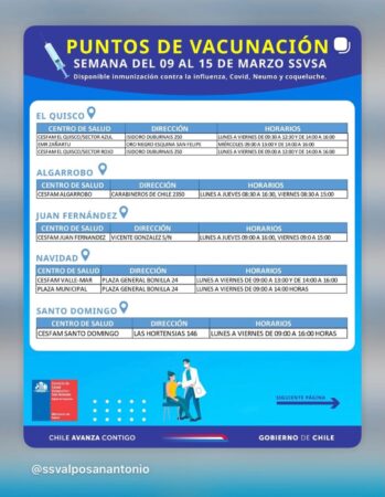 De acuerdo con información del Servicio de Salud Valparaíso–San Antonio, durante marzo se han habilitado diversos centros de vacunación en comunas como San Antonio, Cartagena, El Tabo, Casablanca, Algarrobo, El Quisco, Juan Fernández, Navidad y Santo Domingo, principalmente en CESFAM y centros comunitarios de salud.